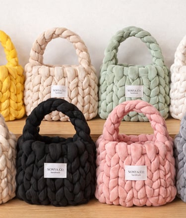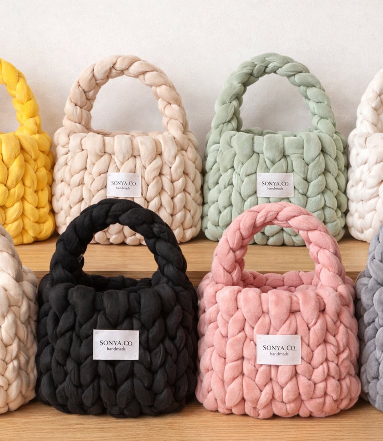 Handcrafted chunky yarn bags with cozy textures.